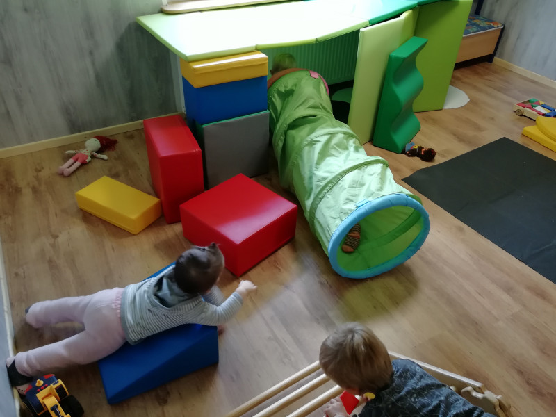 Es gibt in meinen Räumlichkeiten, einige Objekte, die zum krabbeln, klettern, laufen etc. animieren.